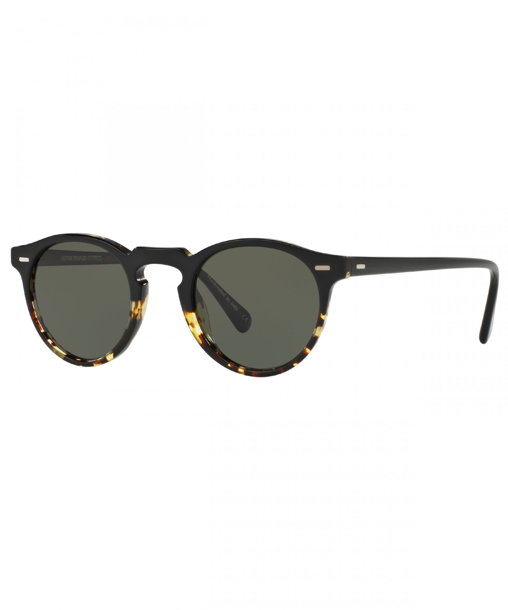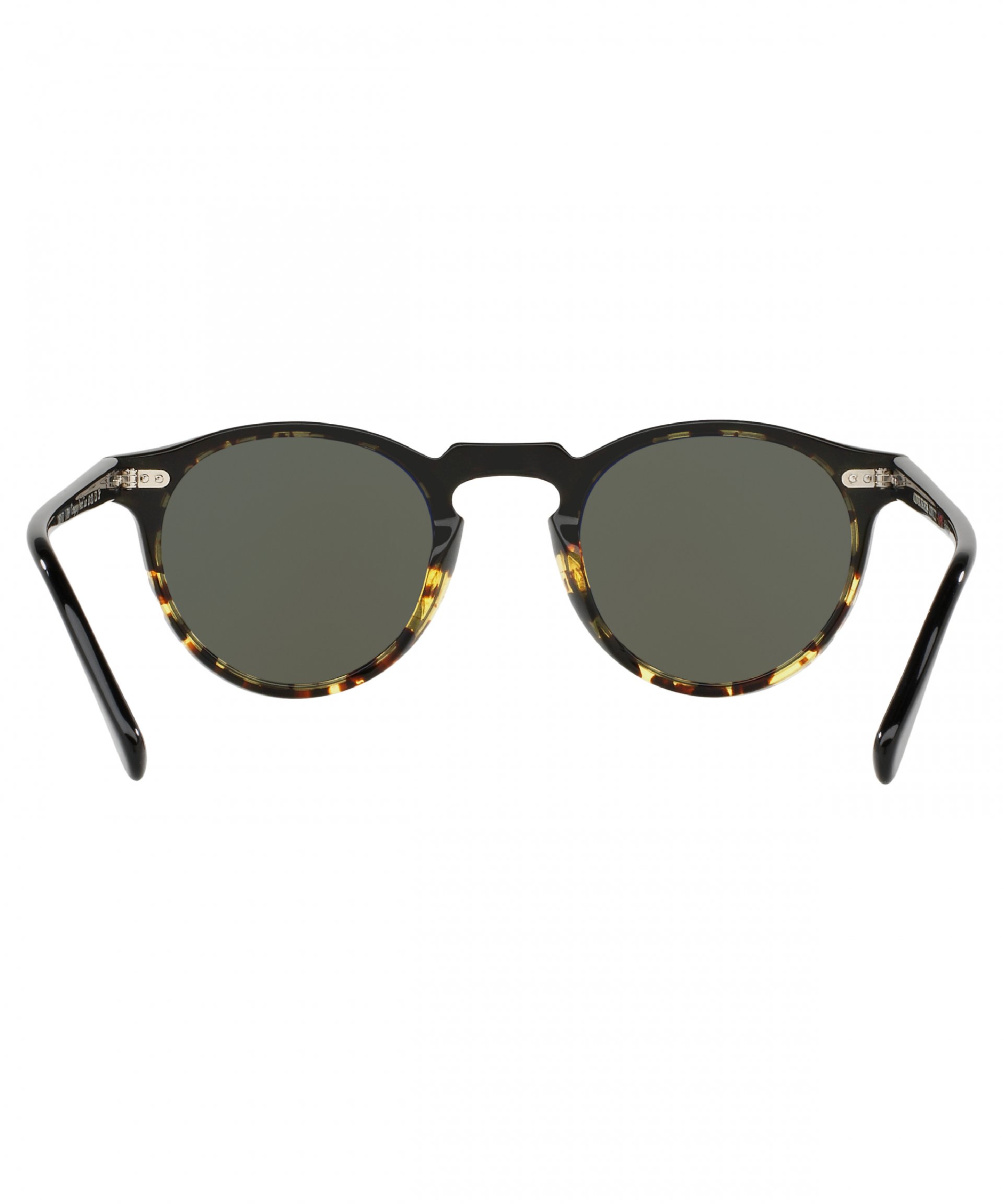 Óculos masculino fabricado em acetato preto com detalhes mesclados e lentes polarizadas em cristal na verde escuro.